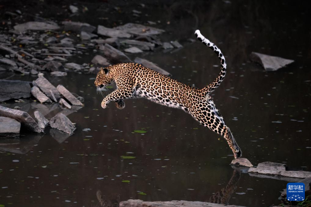这是8月30日在肯尼亚马赛马拉国家保护区拍摄的跳跃中的花豹。