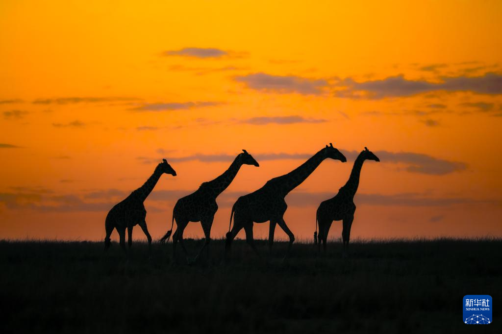 9月1日日出时分,在肯尼亚马赛马拉国家保护区,一群长颈鹿在草原上行走。