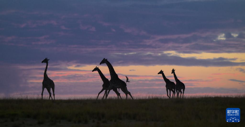 9月1日日出时分,在肯尼亚马赛马拉国家保护区,一群长颈鹿在草原上奔跑。