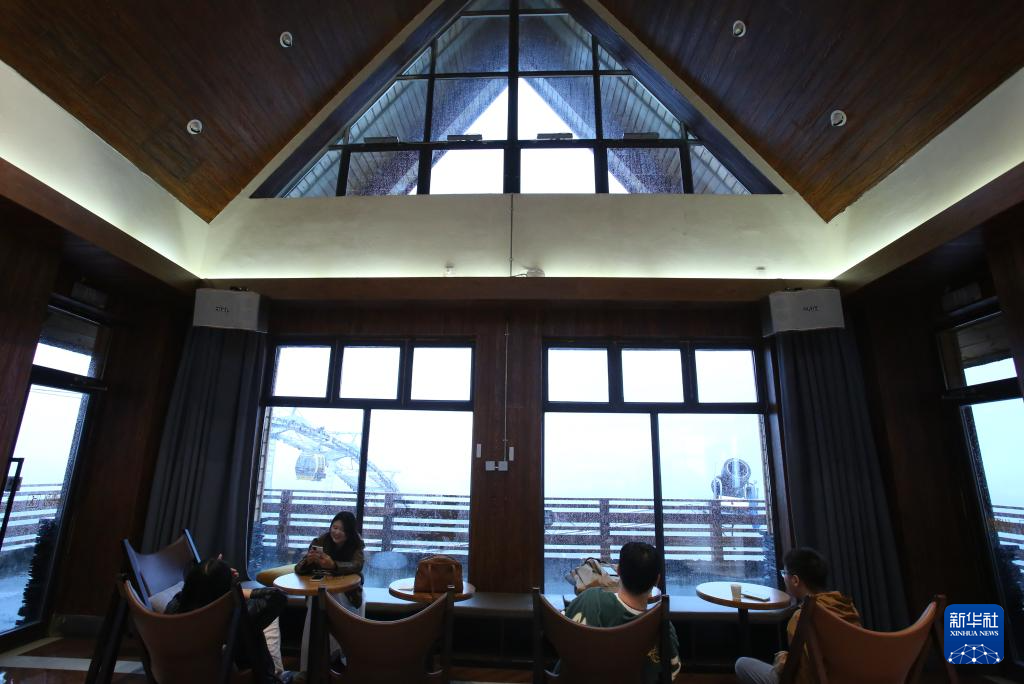 9月9日,游客在新疆阿勒泰将军山国际滑雪度假区山顶咖啡馆休息。
