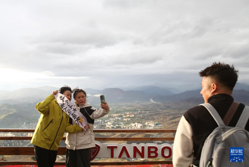 9月9日,游客在新疆阿勒泰将军山国际滑雪度假区山顶留影。