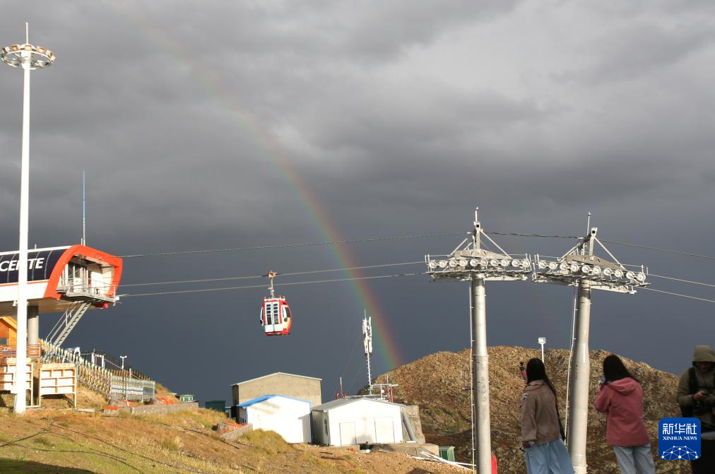 9月9日,游客在新疆阿勒泰将军山国际滑雪度假区山顶拍摄彩虹。