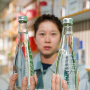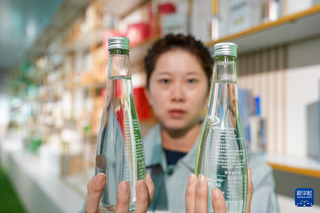 9月10日,在黑龙江省伊春市一家桦树汁生产企业,工作人员在展示一款桦树汁产品。