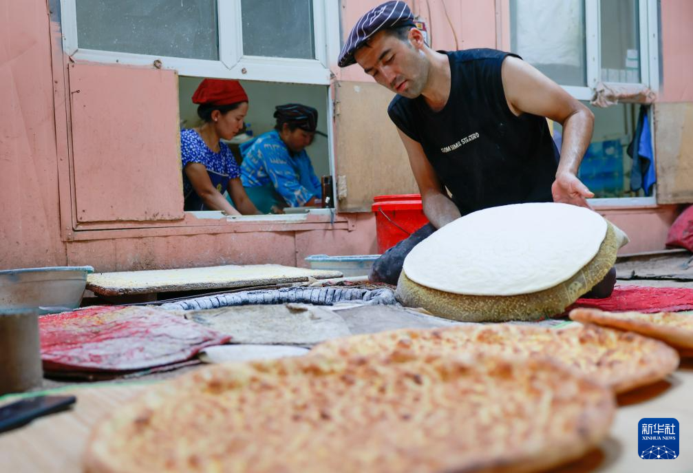 7月21日,在新疆库车市,热西提在自家馕店中制作馕坯。