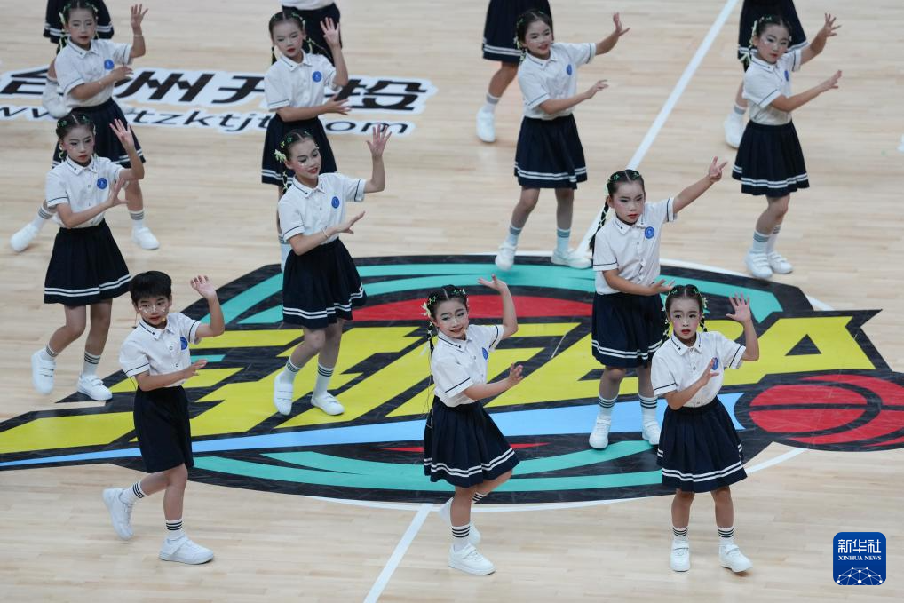 小朋友在进行台州湾新区队主场对阵嘉兴队的比赛前表演(9月10日摄)。
