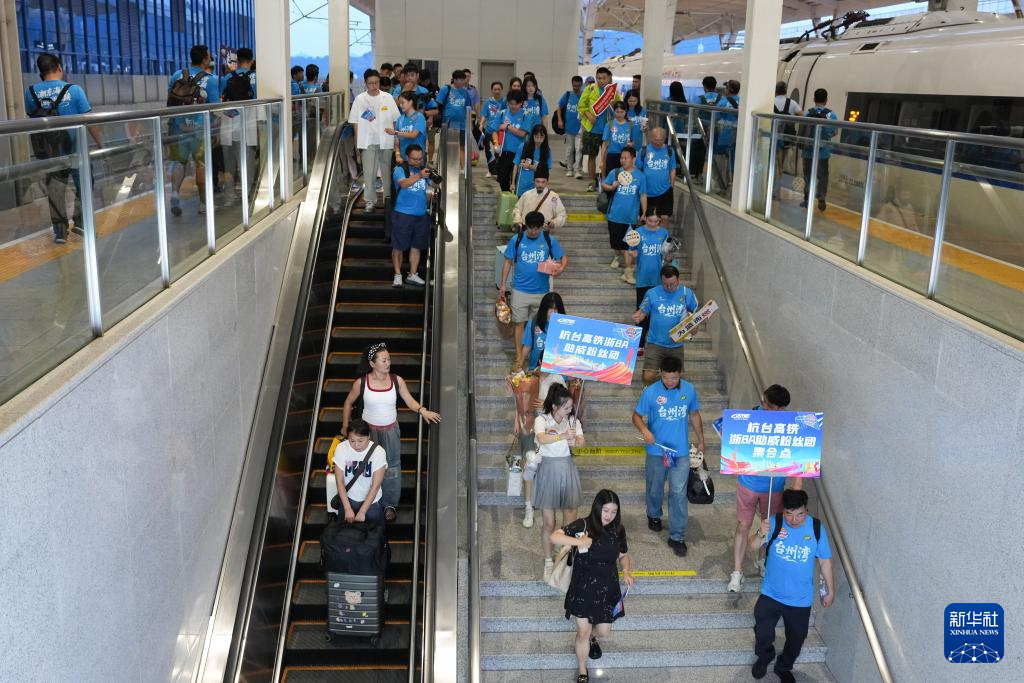 “浙BA”观赛球迷乘坐杭台高铁抵达台州站,在工作人员引导下出站(9月10日摄)。