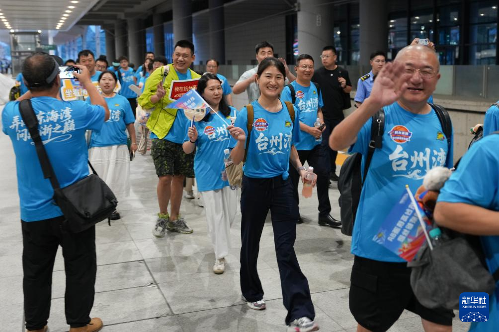 “浙BA”观赛球迷乘坐杭台高铁抵达台州站,在工作人员引导下集体出站(9月10日摄)。