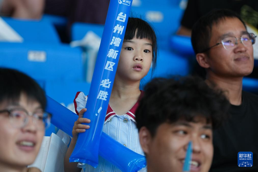 小朋友在观看台州湾新区队与嘉兴队比赛(9月10日摄)。