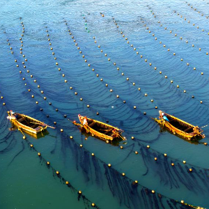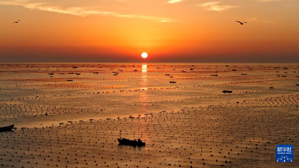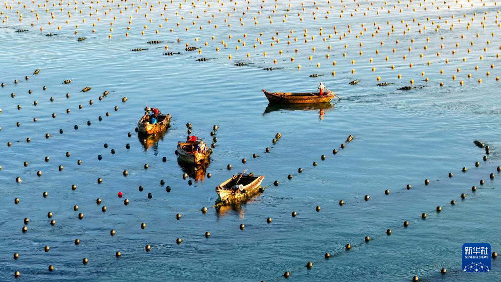 9月11日,在山东省荣成市爱伦湾海洋牧场,渔民驾驶渔船从事海上生产(无人机照片)。