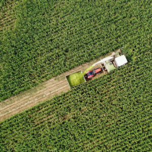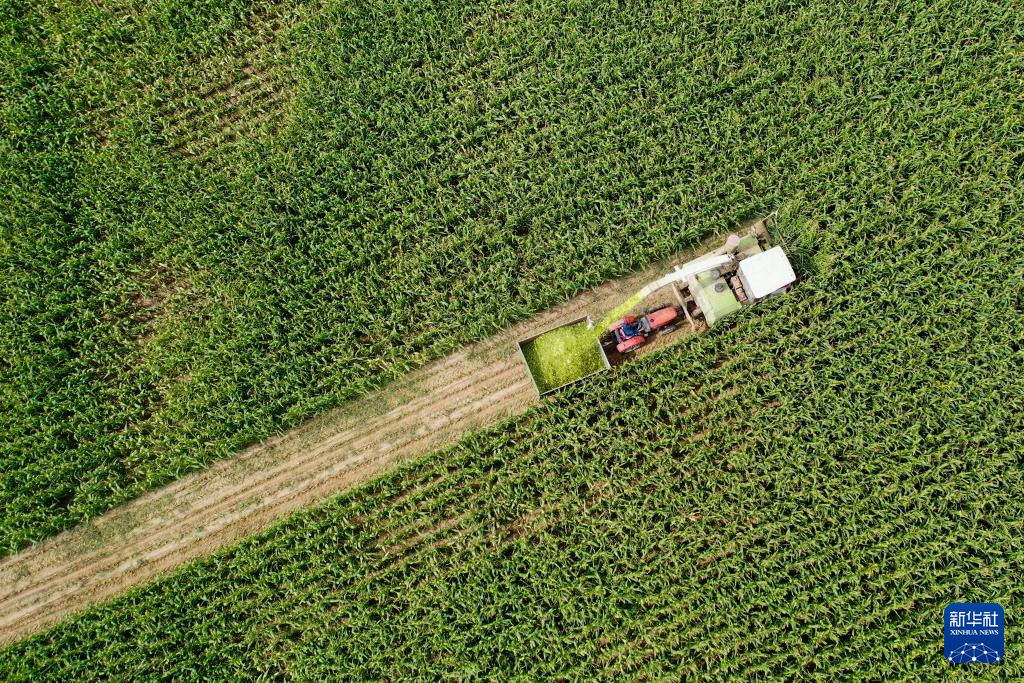 9月11日,农机手操作农机在杭锦旗吉日嘎朗图镇格更召嘎查田间收割青贮玉米(无人机照片)。