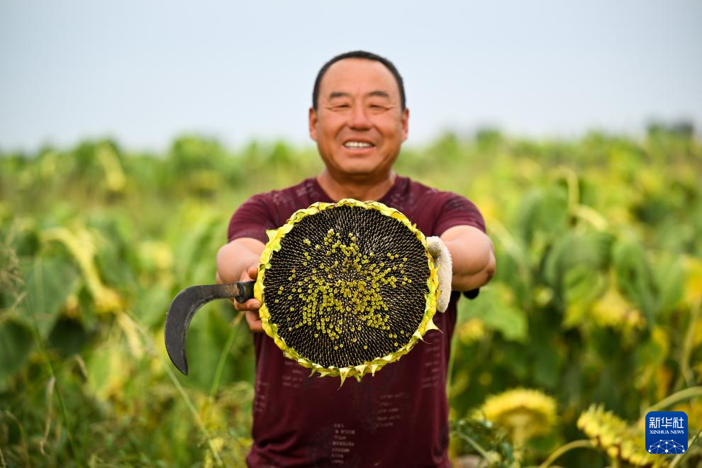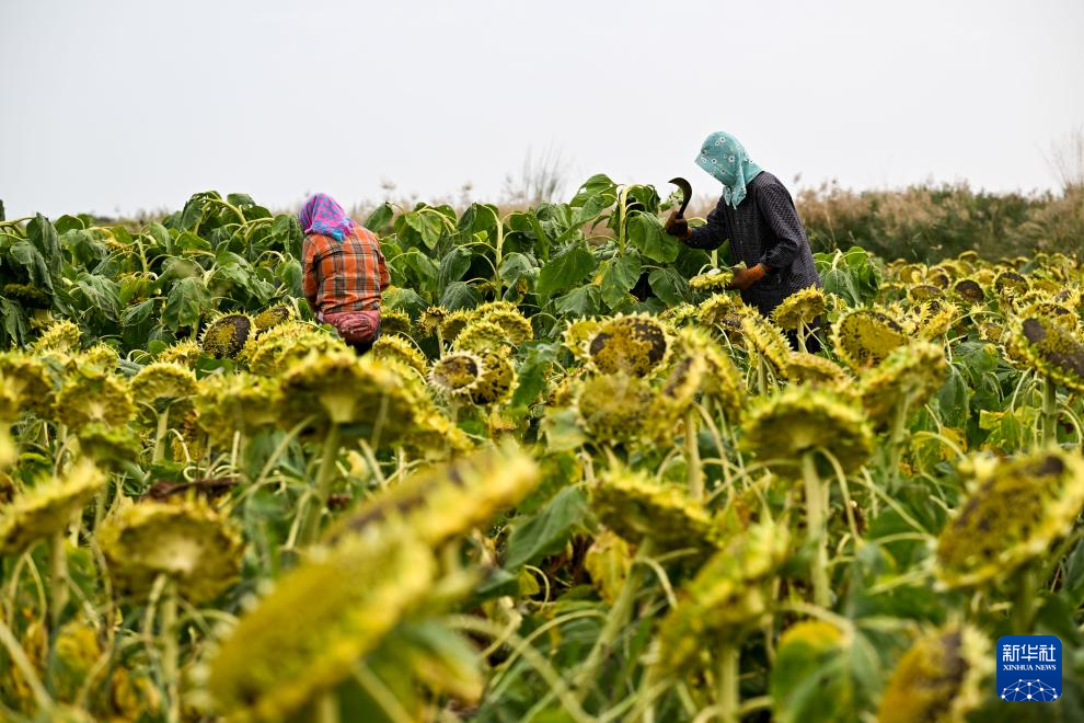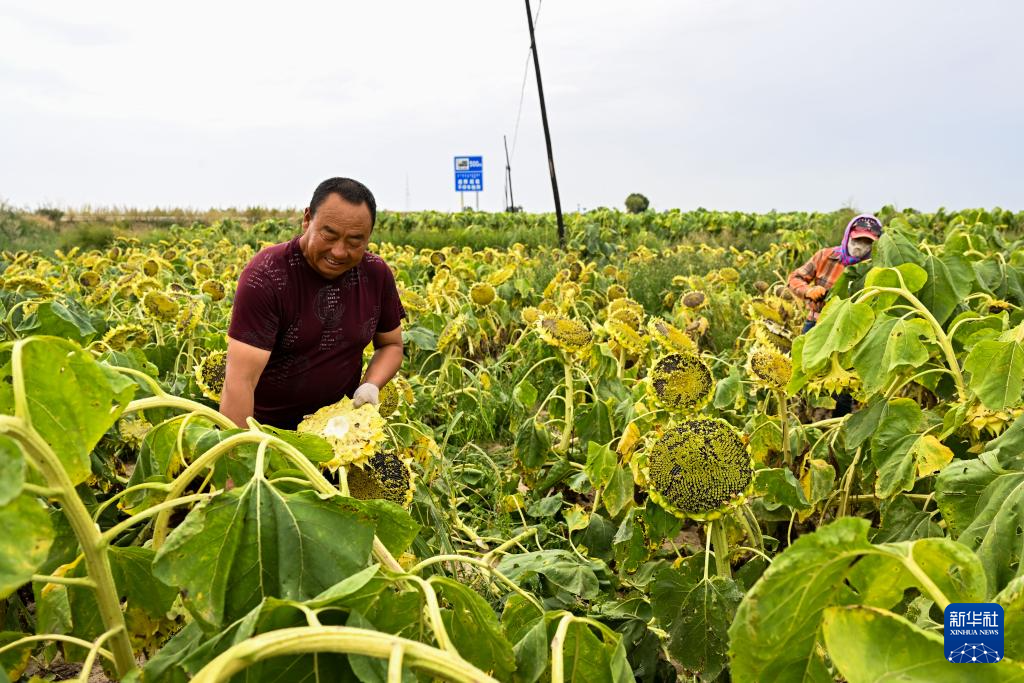 9月11日,农民在杭锦旗吉日嘎朗图镇光前村田间收割葵花。