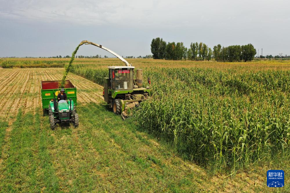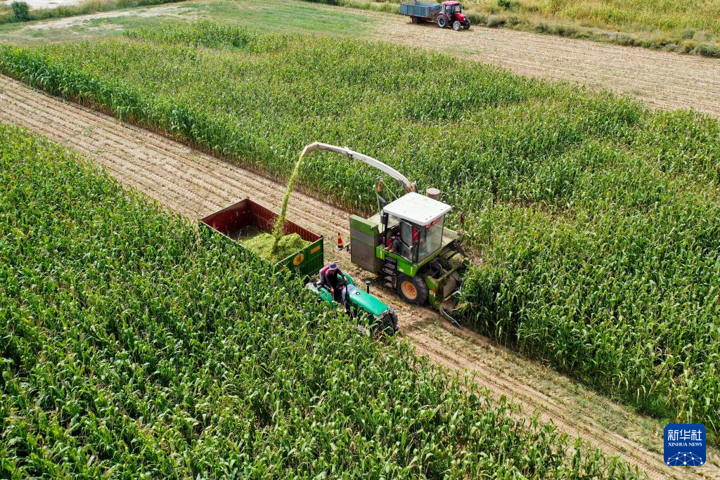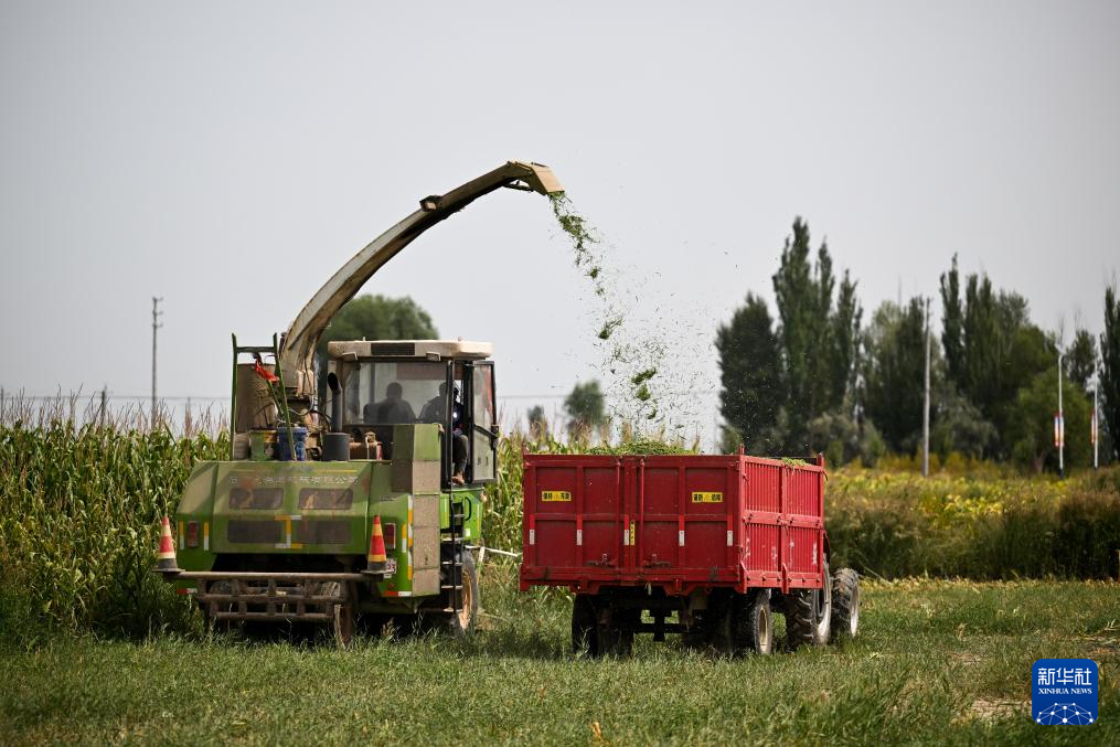 9月11日,农机手操作农机在杭锦旗吉日嘎朗图镇格更召嘎查田间收割青贮玉米。