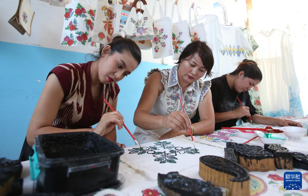 9月11日,在新疆喀什英吉沙县土陶村,国家级非物质文化遗产“模戳印花布”县级传承人在现场制作。依托国家级非物质文化遗产“维吾尔族模制法土陶烧制技艺”,土陶村深挖非遗价值,通过打造民族特色景观、开展体验研学等,有效探索“非遗+旅游”创新融合发展新路径,并带动快递、民宿、农家乐、水果采摘园等产业发展。