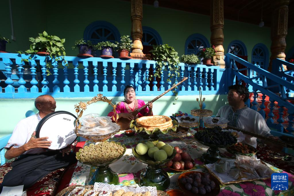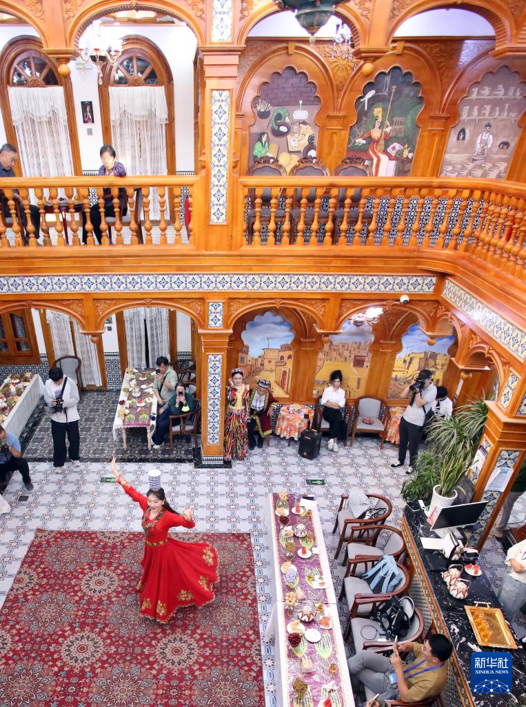9月10日,游客在新疆喀什古城景区“古丽的家”民宿观看表演。喀什古城景区历史底蕴深厚,2025年1至7月,接待游客达1668.6万人次,实现旅游综合收入74.7亿元。