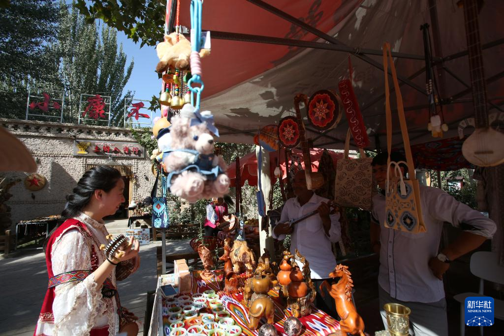 9月11日,游客在新疆喀什英吉沙县土陶村游玩。依托国家级非物质文化遗产“维吾尔族模制法土陶烧制技艺”,土陶村深挖非遗价值,通过打造民族特色景观、开展体验研学等,有效探索“非遗+旅游”创新融合发展新路径,并带动快递、民宿、农家乐、水果采摘园等产业发展。