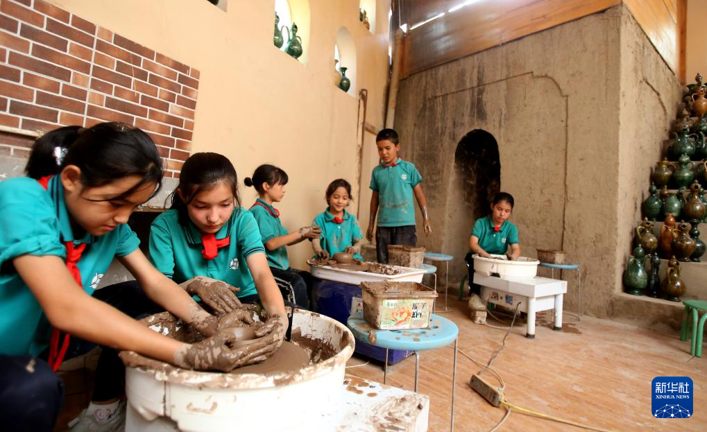 9月11日,学生在新疆喀什英吉沙县土陶村体验制作陶器。依托国家级非物质文化遗产“维吾尔族模制法土陶烧制技艺”,土陶村深挖非遗价值,通过打造民族特色景观、开展体验研学等,有效探索“非遗+旅游”创新融合发展新路径,并带动快递、民宿、农家乐、水果采摘园等产业发展。