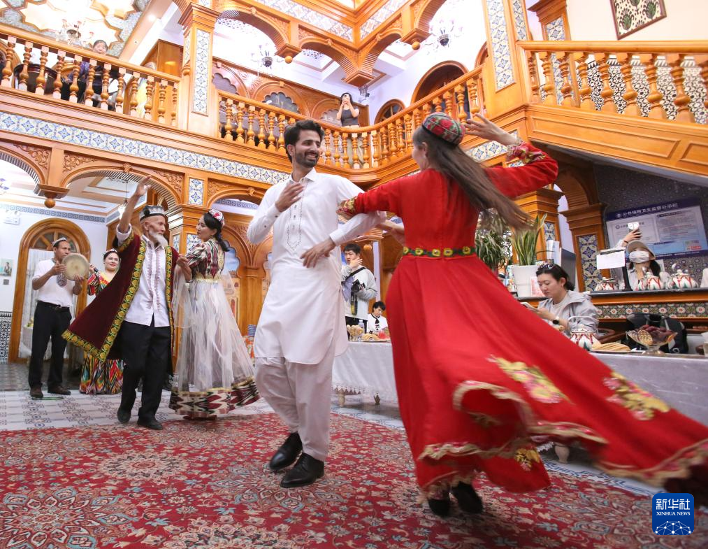 9月10日,来自巴基斯坦的游客韩帅(前右二)在新疆喀什古城景区“古丽的家”民宿与工作人员跳舞。喀什古城景区历史底蕴深厚,2025年1至7月,接待游客达1668.6万人次,实现旅游综合收入74.7亿元。