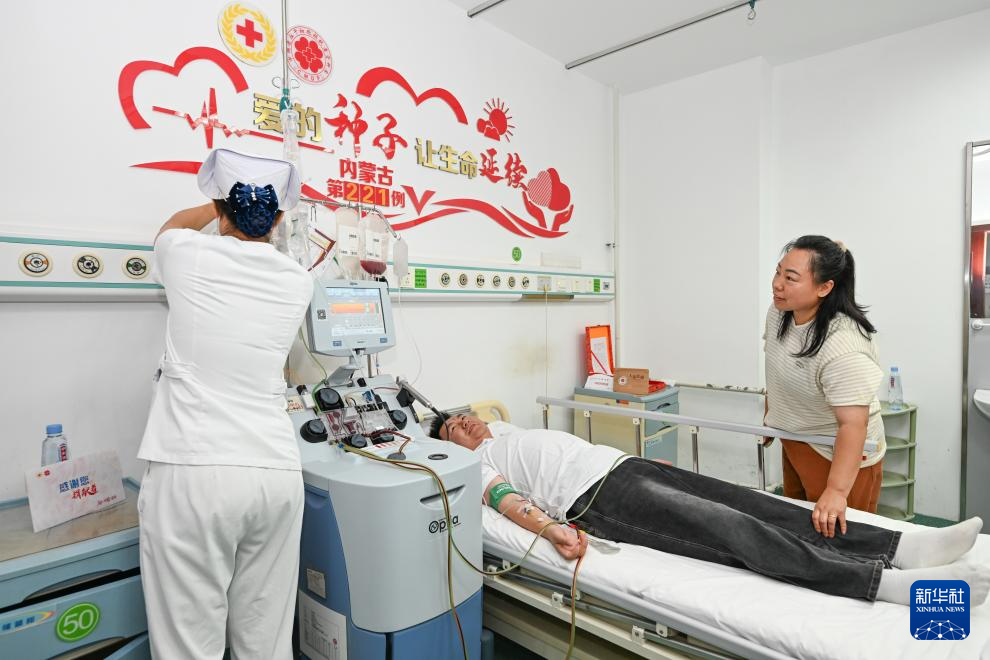 9月12日,在内蒙古医科大学附属医院造血干细胞捐献采集室,薛先生(中)在捐献造血干细胞。