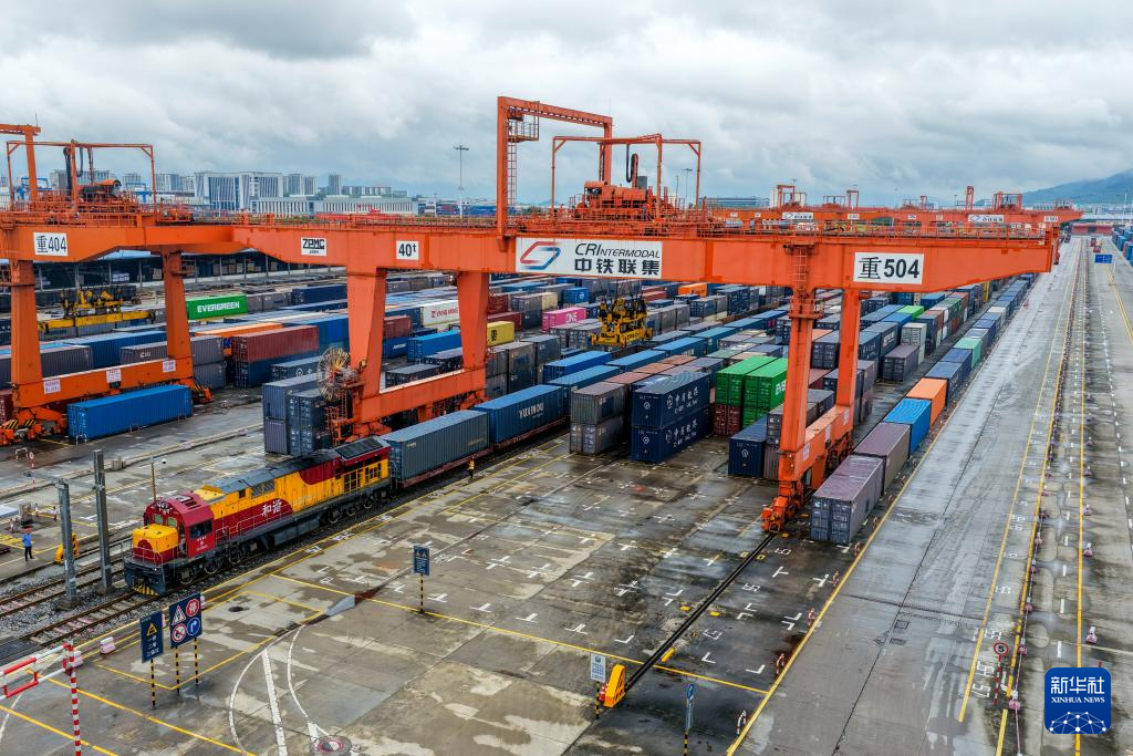 9月13日,满载汽车零配件、笔记本电脑等货物的中亚班列在重庆团结村中心站发车(无人机照片)。