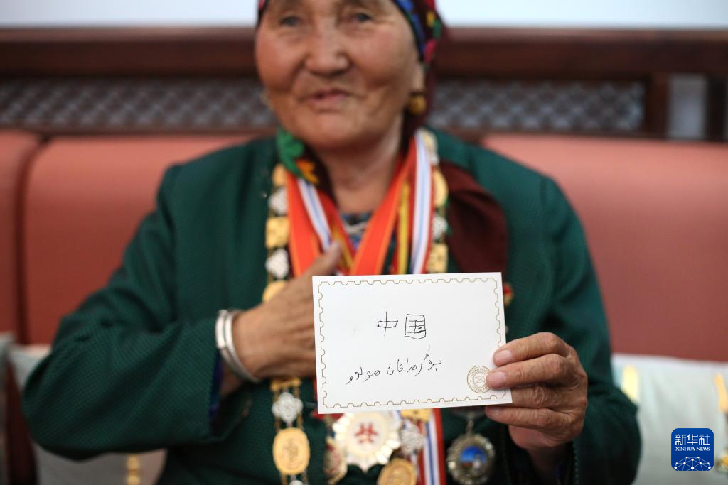 9月13日,布茹玛汗·毛勒朵在家里展示她写的“中国”两字和自己的名字。