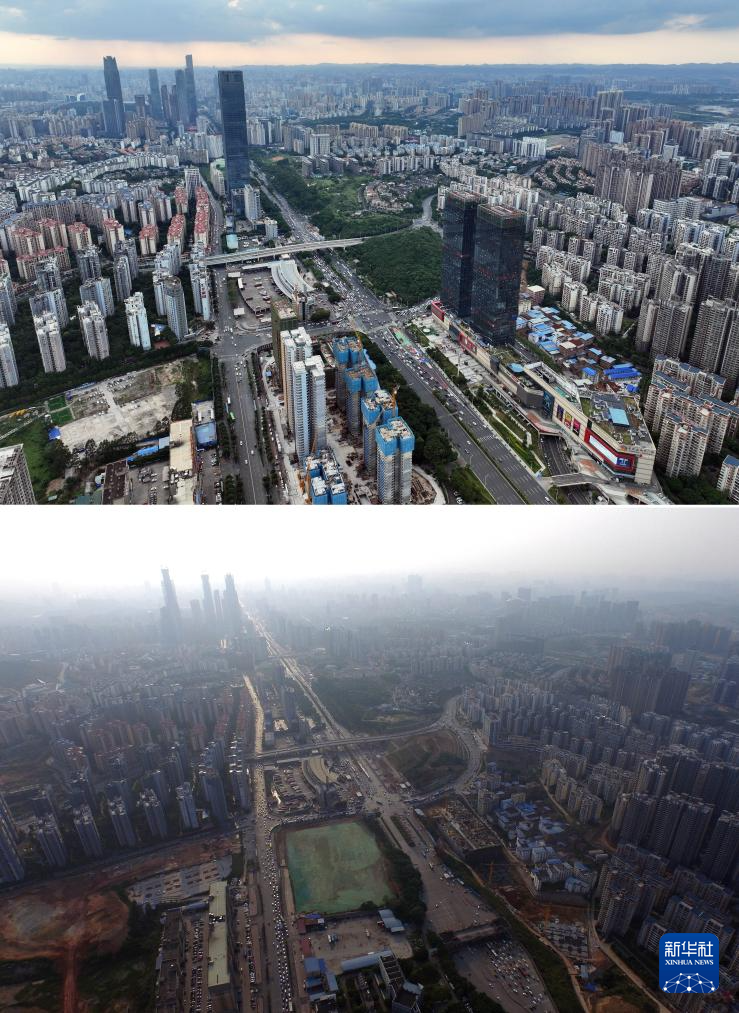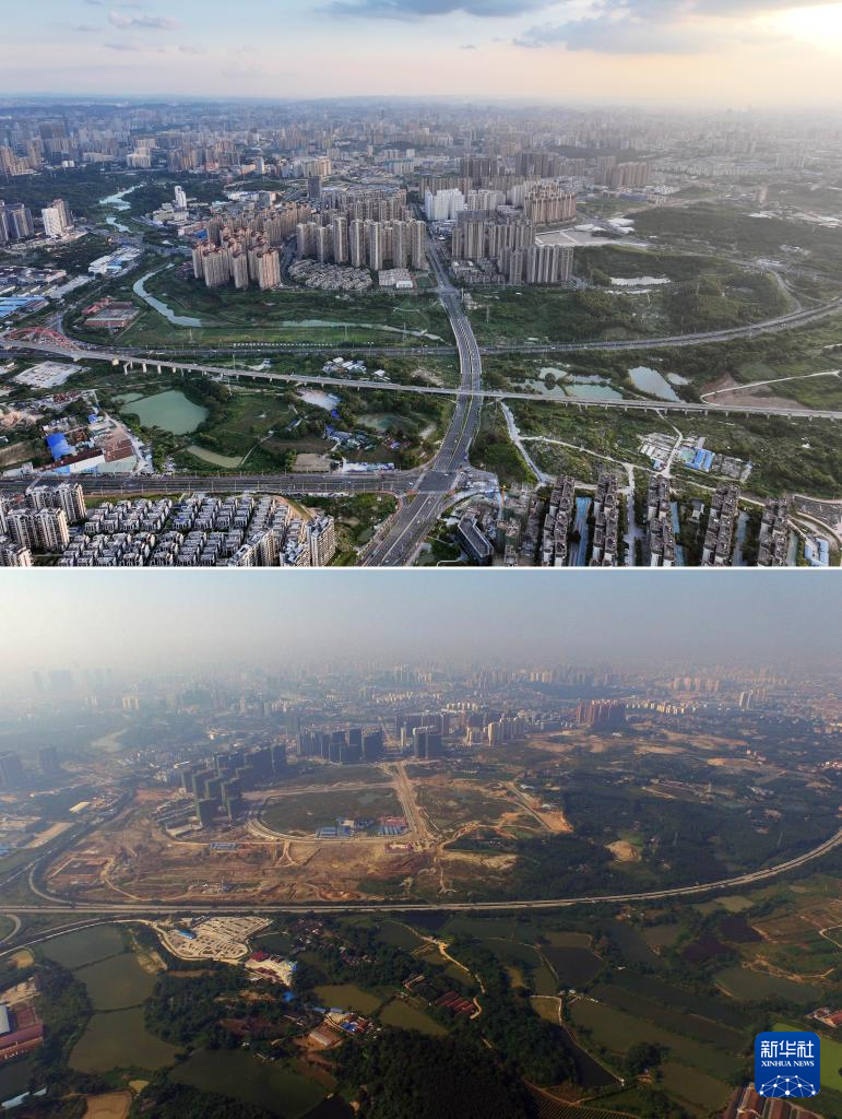 拼版照片:上图为广西南宁市那安快速路两侧的建筑及景观(无人机照片,2025年9月6日摄),下图为广西南宁市绕城高速公路(现为那安快速路)两侧的建筑及景观(无人机照片,2015年8月10日摄)。