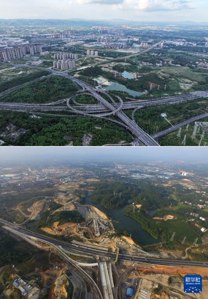 拼版照片:上图为广西南宁东站附近的北凤立交桥(无人机照片,2025年9月6日摄);下图为正在建设中的南宁市北凤立交桥(无人机照片,2015年8月15日摄)。