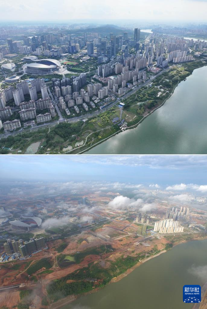 拼版照片:这是广西南宁市五象新区一处沿江公园建成前后对比图(无人机照片,上图为2025年9月6日摄,下图为2015年8月13日摄)。