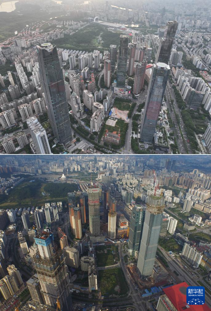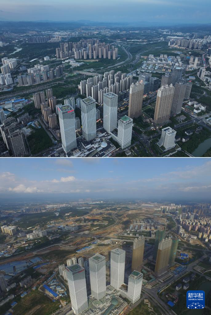 拼版照片:广西南宁市五象新区十年前后对比图(无人机照片,上图为2025年9月6日摄,下图为2015年8月16日摄)。