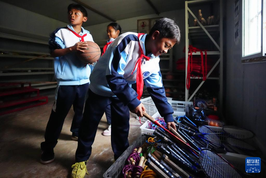 9月15日,戈的小学学生在学校体育器械室挑选羽毛球拍。