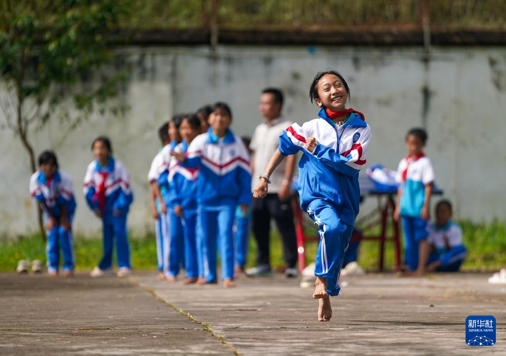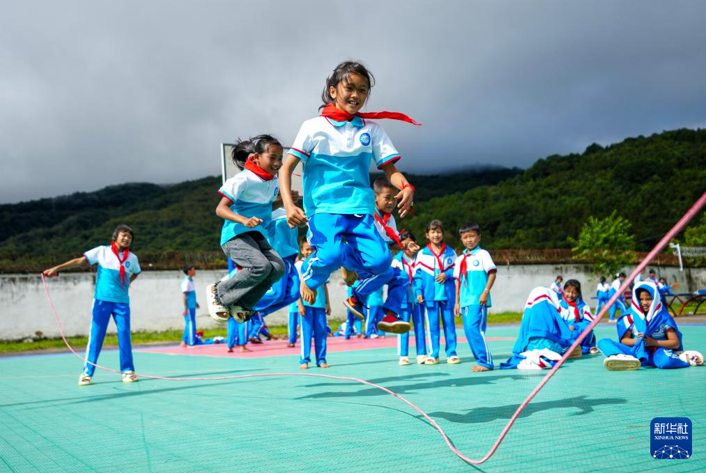 9月15日,戈的小学学生课间在操场跳绳(无人机照片)。