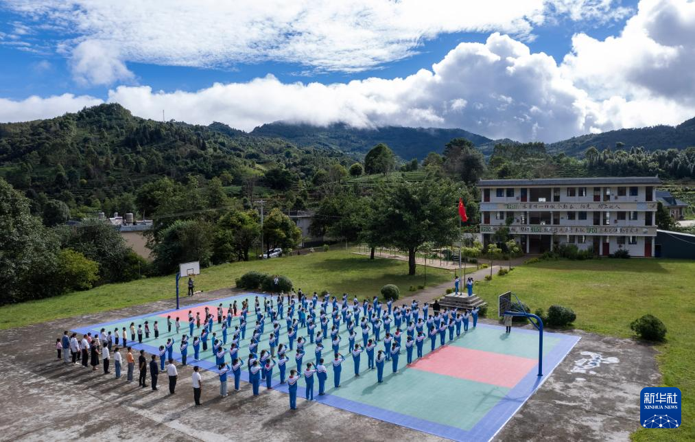 9月15日,腊福小学师生在操场参加升旗仪式(无人机照片)。