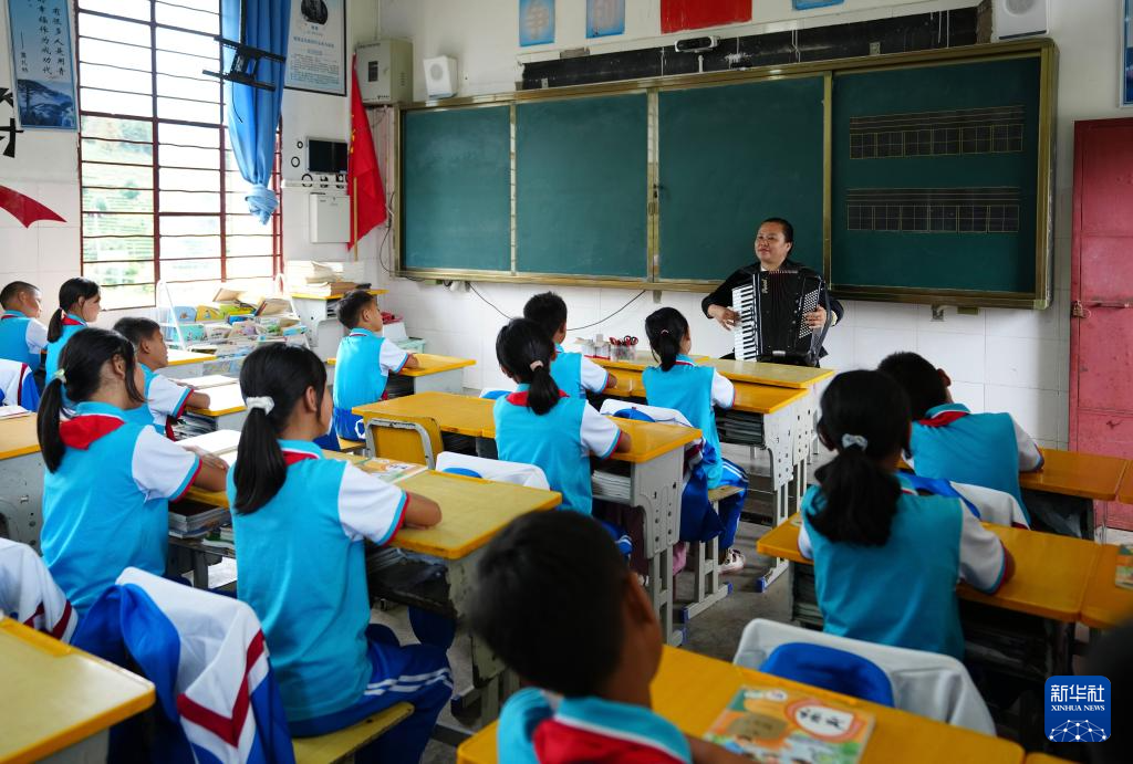 9月15日,腊福小学一名老师在教室里带领学生上音乐课。