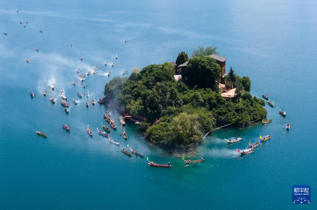9月16日,当地群众驾着猪槽船在泸沽湖的王妃岛转海(无人机照片)。