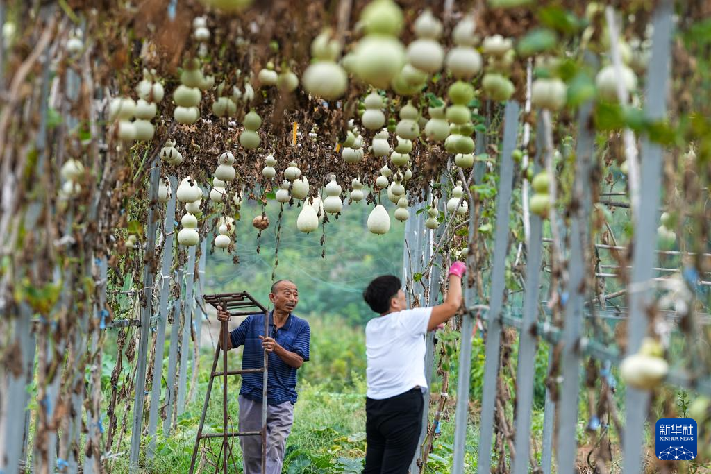 9月16日,村民在肥城市老城街道张家花峪村打理观赏葫芦。2022年,这个村创办肥城市七姑娘顶生态农业专业合作社,引导村民栽植葫芦3000余株,发展葫芦种植特色产业。