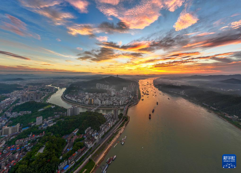 9月16日清晨在广西梧州拍摄的西江水域朝霞(无人机照片)。