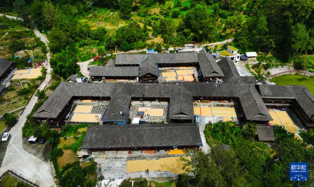 9月16日,重庆市黔江区小南海镇桥梁村古枫寨村民在晒秋(无人机照片)。