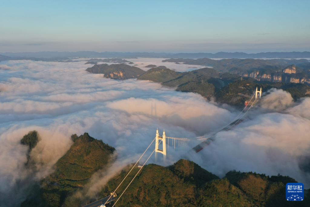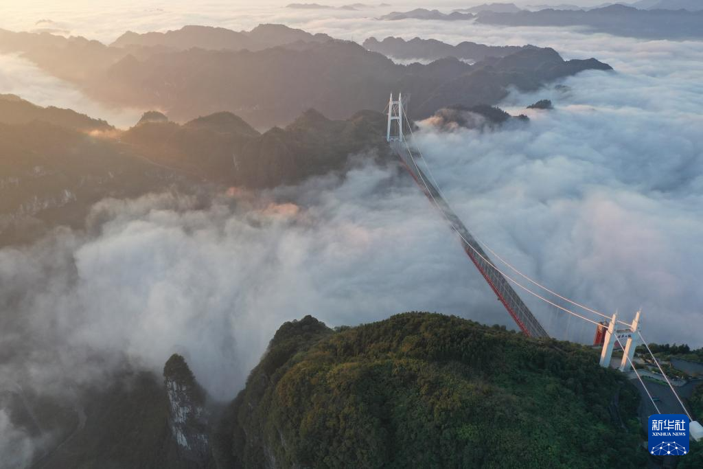 9月16日清晨拍摄的湖南省湘西土家族苗族自治州吉首市矮寨特大悬索桥(无人机照片)。