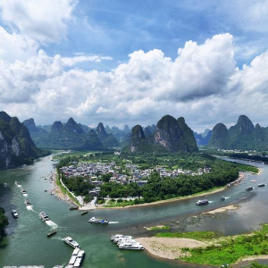9月13日,在漓江广西桂林市阳朔县兴坪镇段,游人游览漓江两岸风光(无人机全景照片)。