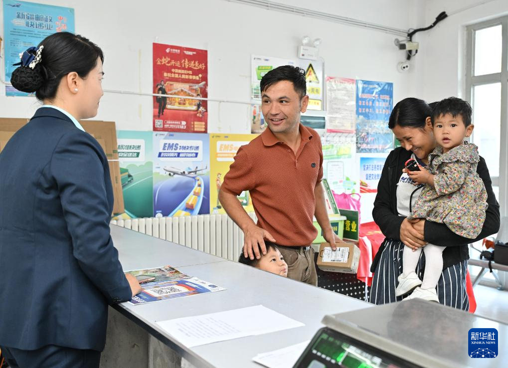 新疆伊犁州米粮泉乡村民艾尼瓦尔(左二)带着妻子和两个孩子在米粮泉村邮政所收取快递。近年来,伊犁州邮政分公司通过和公交公司合作,利用公交车的冗余载能将邮件投送到村级邮政所,为当地各族群众带来便利(9月8日摄)。