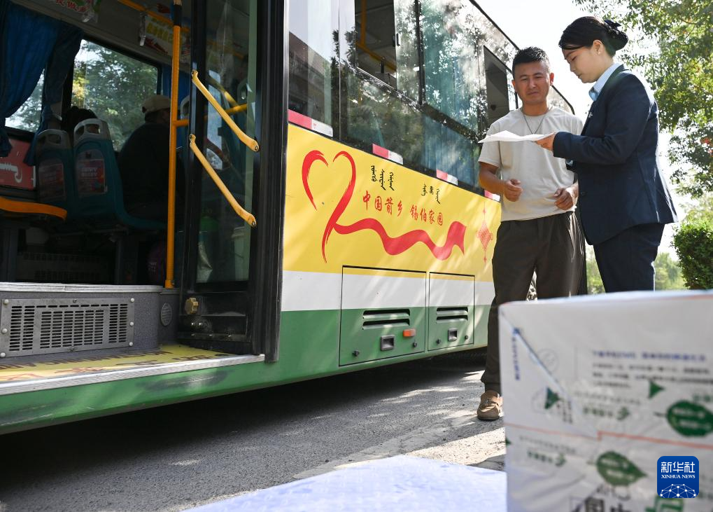 新疆伊犁州米粮泉乡米粮泉村邮政所工作人员(右)在同公交车司机交接邮件。近年来,伊犁州邮政分公司通过和公交公司合作,利用公交车的冗余载能将邮件投送到村级邮政所,为当地各族群众带来便利(9月8日摄)。