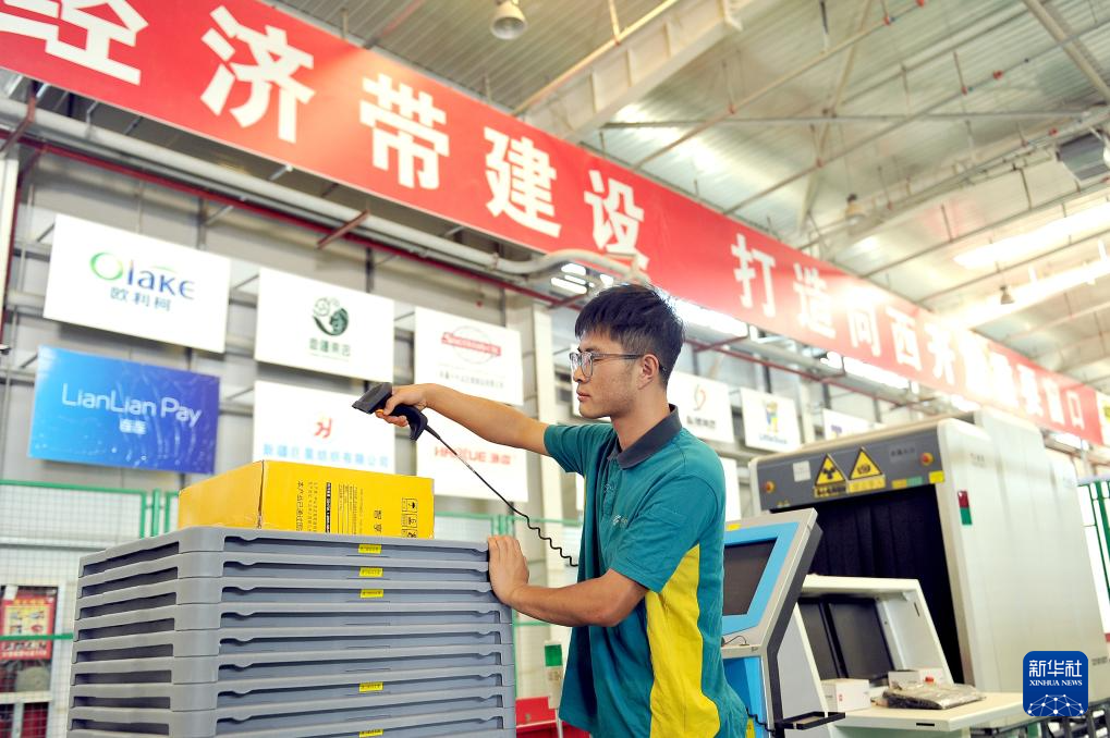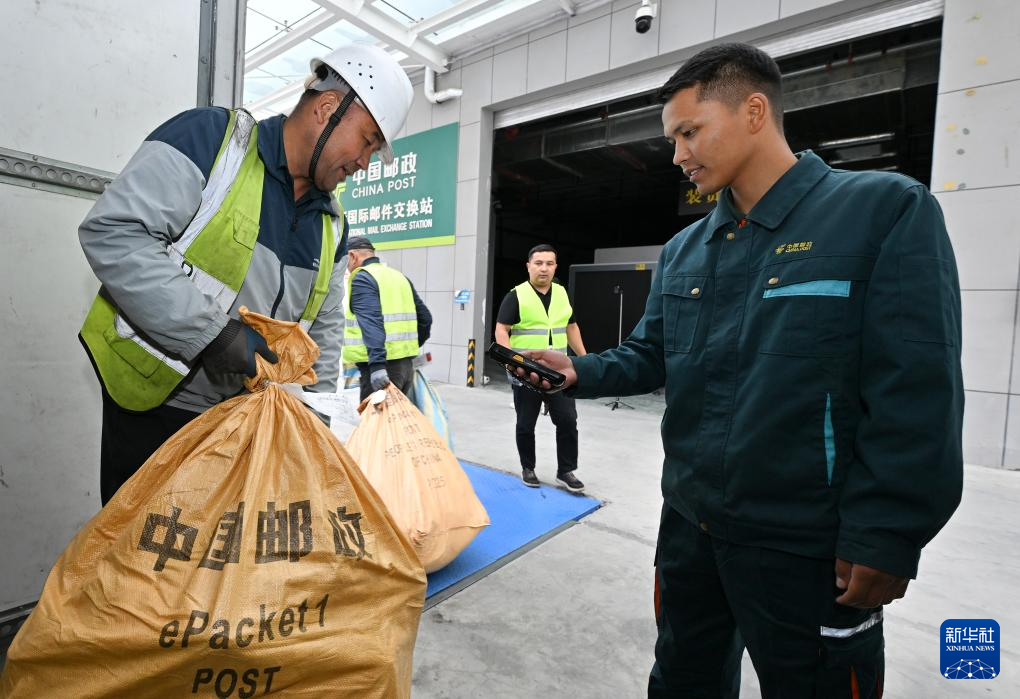 在新疆霍尔果斯国际邮件交换站,中国邮政工作人员(右一)在为即将交换到哈萨克斯坦邮政的邮包扫码转运。据了解,霍尔果斯国际邮件交换站于2022年7月正式运营,以进出口物流渠道为支持,为跨境电商产业链上下游提供仓储和快递物流综合解决方案。承运中国至中亚多国、俄罗斯以及欧洲国家的出口国际邮件。3年来,累计国际邮件交换量2026吨(9月11日摄)。