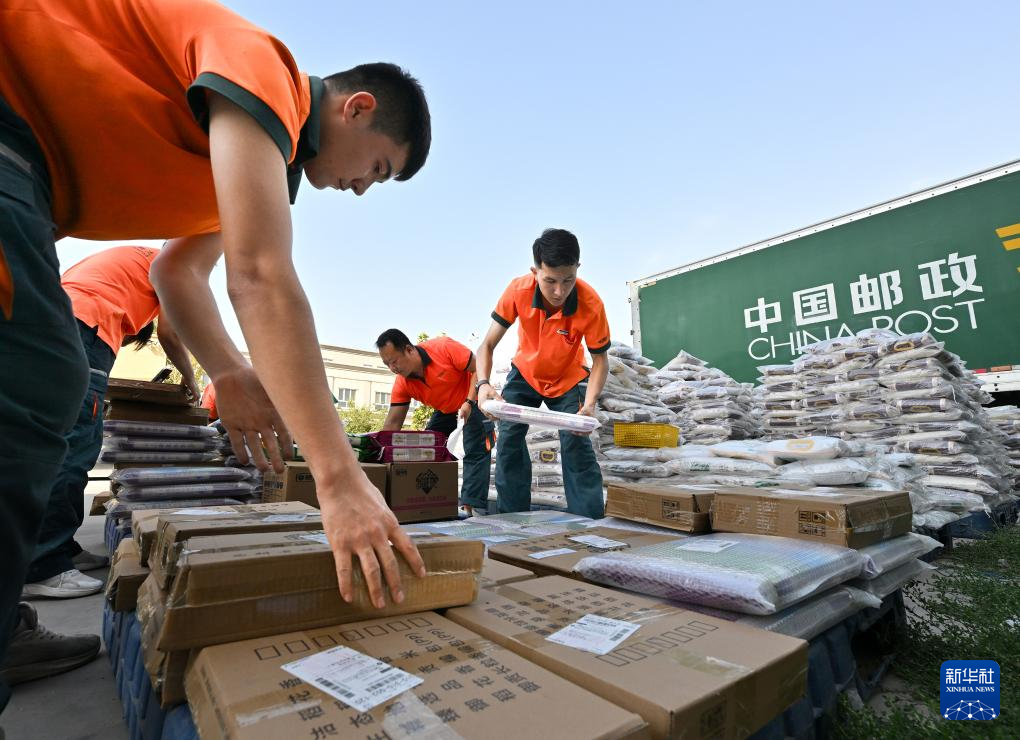 新疆叶城邮政员工麦麦提艾力·吾布力(左)与艾尼瓦尔·阿迪力在该县宗朗乡九麟甄选合作社装运糯玉米。封装、打包、贴单……邮车开进农产品加工企业,第一时间将十多种农产品发往全国各地。近年来,新疆邮政分公司“邮企合作”解决了农产品“运输难、销路窄”的痛点,带动了当地种植户的收益增长,形成“企业增效、农户增收、产业发展”的良性循环(9月10日摄)。