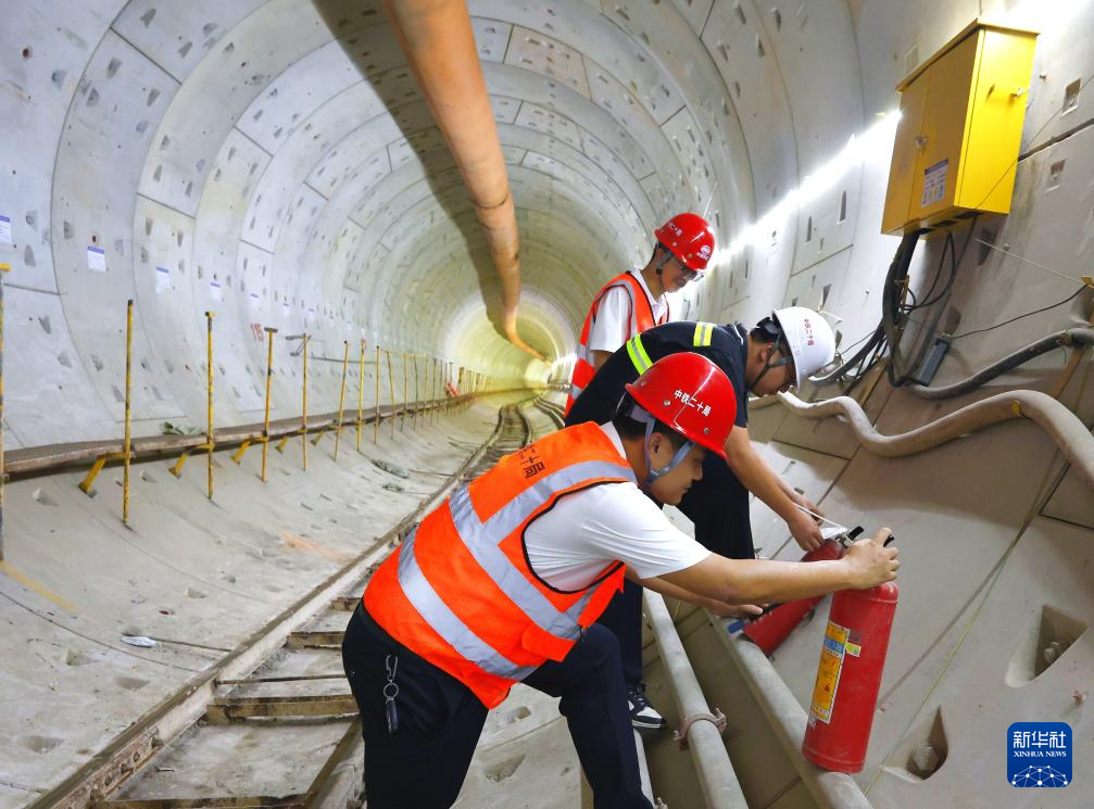 安全监理人员在深圳地铁16号线共建管廊检查施工现场的消防设施(9月16日摄)。