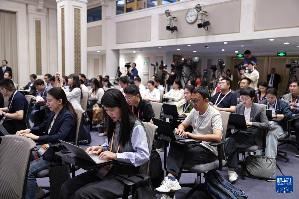 9月17日,国务院新闻办公室在北京举行“高质量完成‘十四五’规划”系列主题新闻发布会,国务院国资委主任张玉卓、国务院国资委副主任袁野、国务院国资委副主任李镇介绍砥砺奋进“十四五”,中央企业高质量发展情况,并答记者问。这是记者在现场工作。