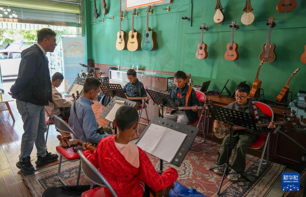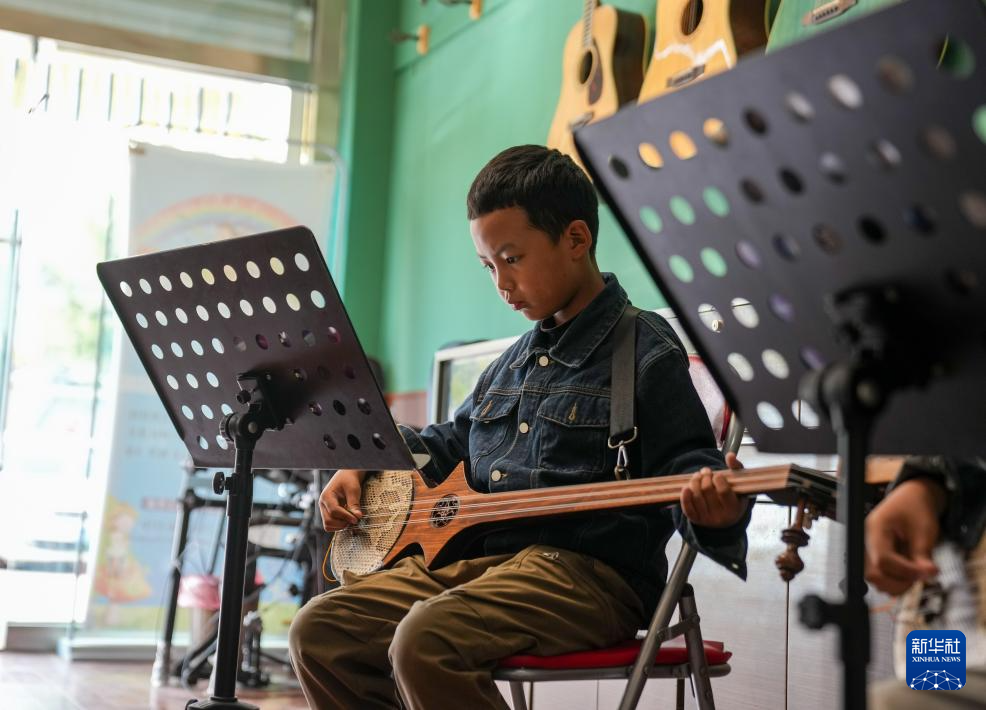 9月13日,在拉萨市古乐扎念琴行,孩子们在弹奏扎念琴。