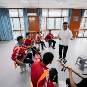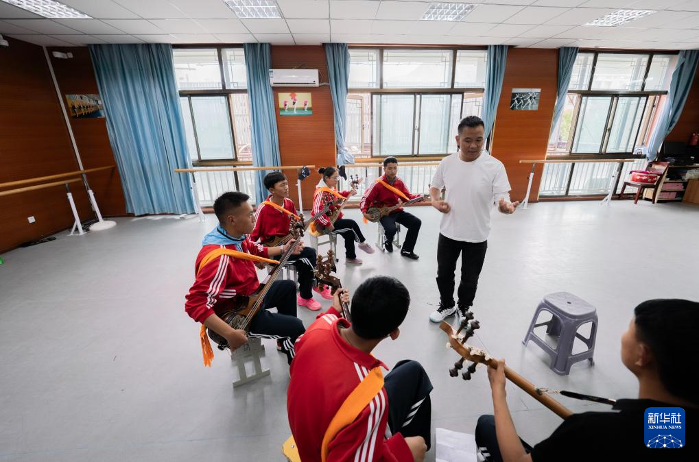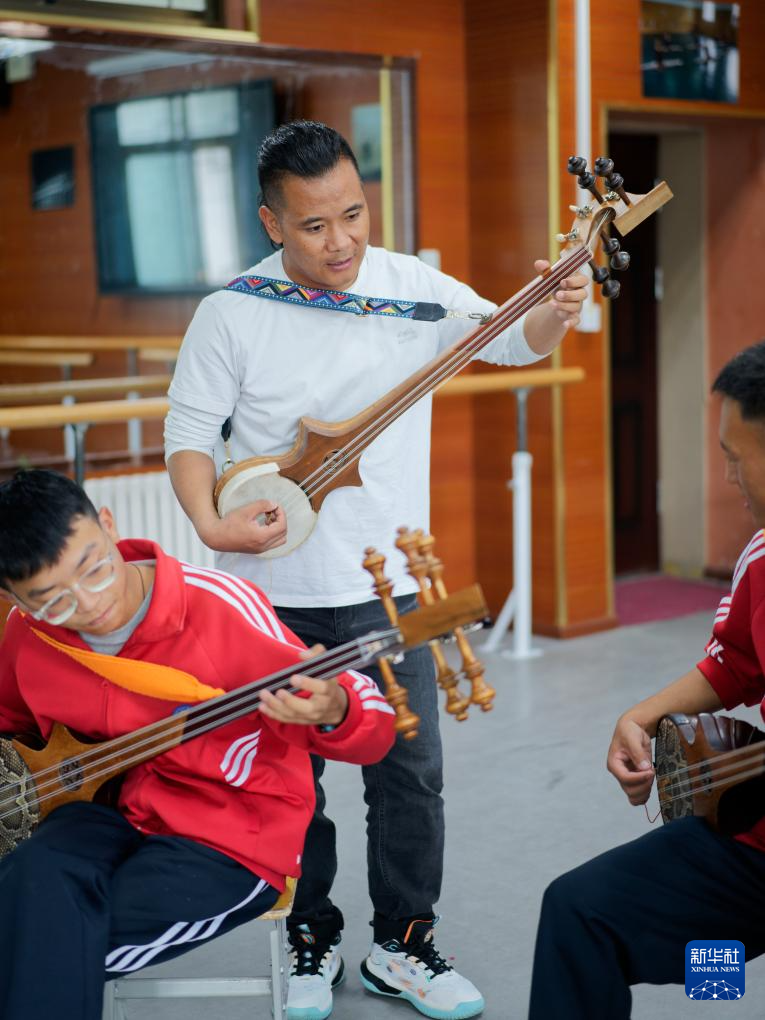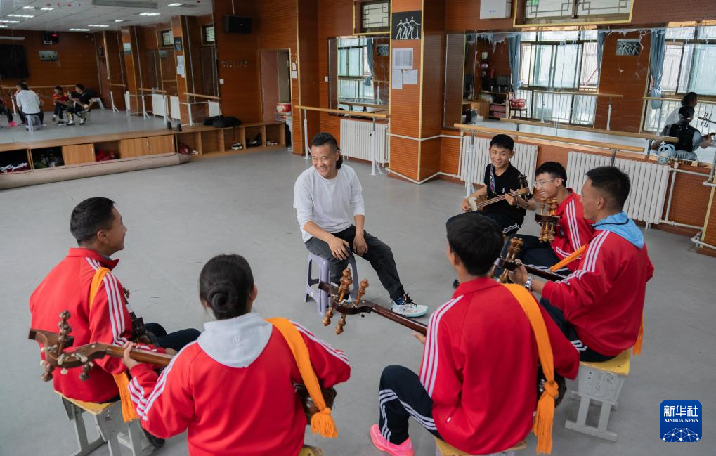 9月9日,在拉萨市第二中等职业技术学校,洛桑次仁老师在给孩子们传授扎念琴弹奏的要领。