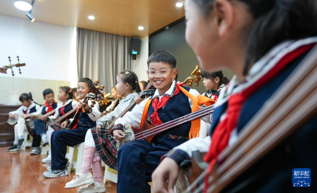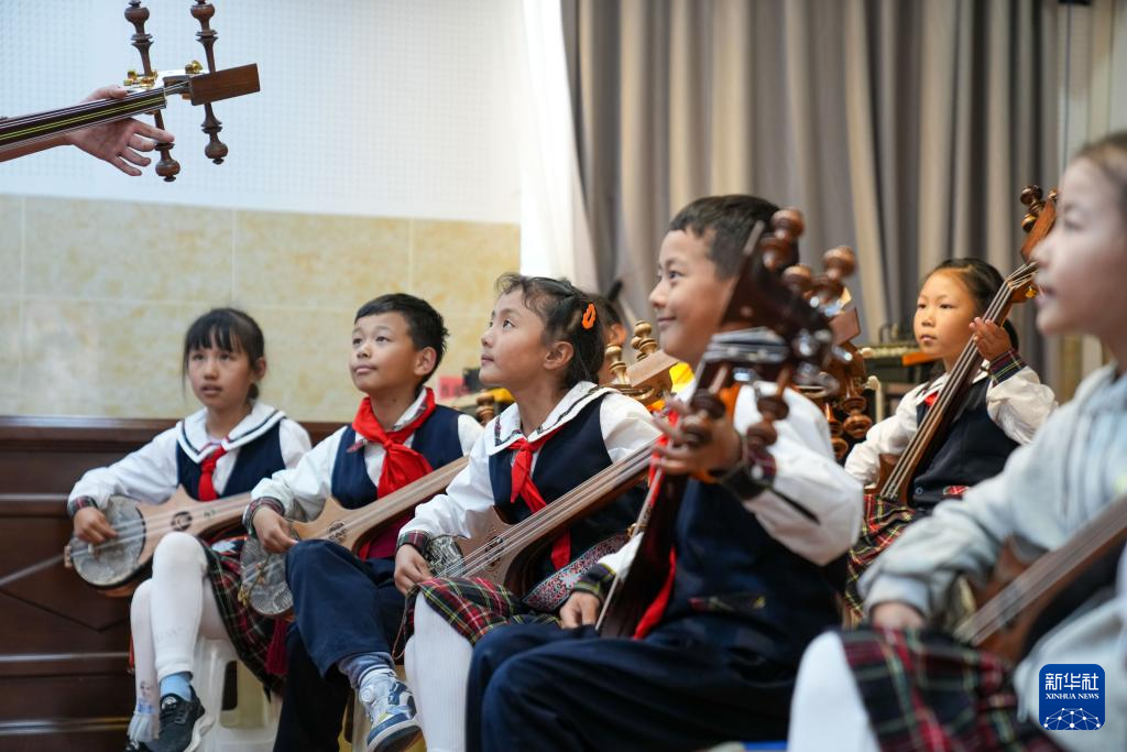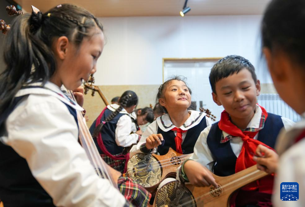 9月11日,在拉萨市实验小学,孩子们在弹奏扎念琴。