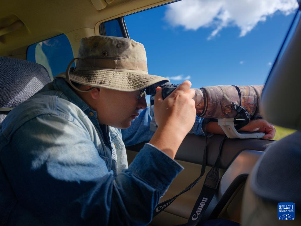9月16日,在额尔古纳湿地,宝金财在车中使用长焦镜头拍摄鸟类。