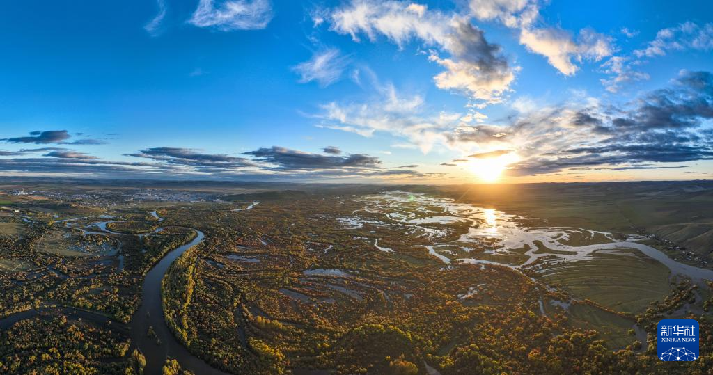 9月16日拍摄的额尔古纳湿地自然保护区日落景色(无人机全景照片)。