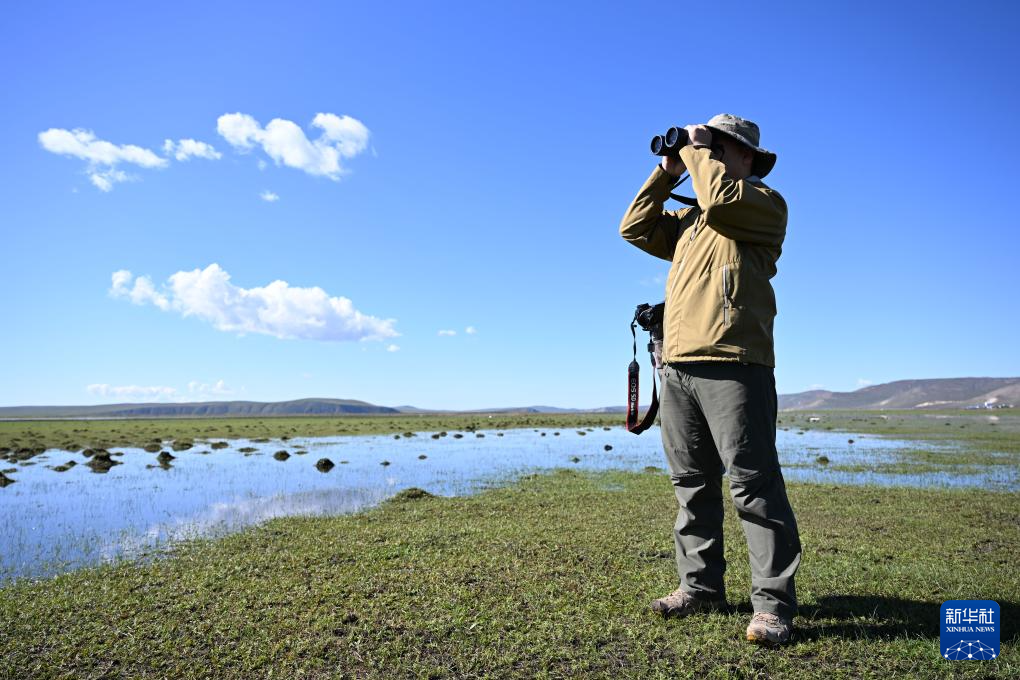 9月15日,宝金财在额尔古纳湿地自然保护区使用望远镜观测鸟类。
